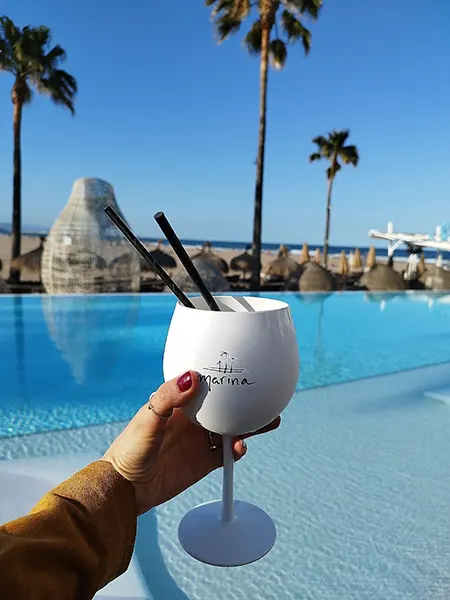 La coctelería es otro de los pilares del club. Mojitos tropicales, combinados refrescantes y cócteles de autor se sirven en un entorno donde cada detalle cuenta. Además, Marina Beach es conocido por su carta de champanes y espumosos de alta gama, pensados para quienes quieren dar un toque de lujo a su tarde.