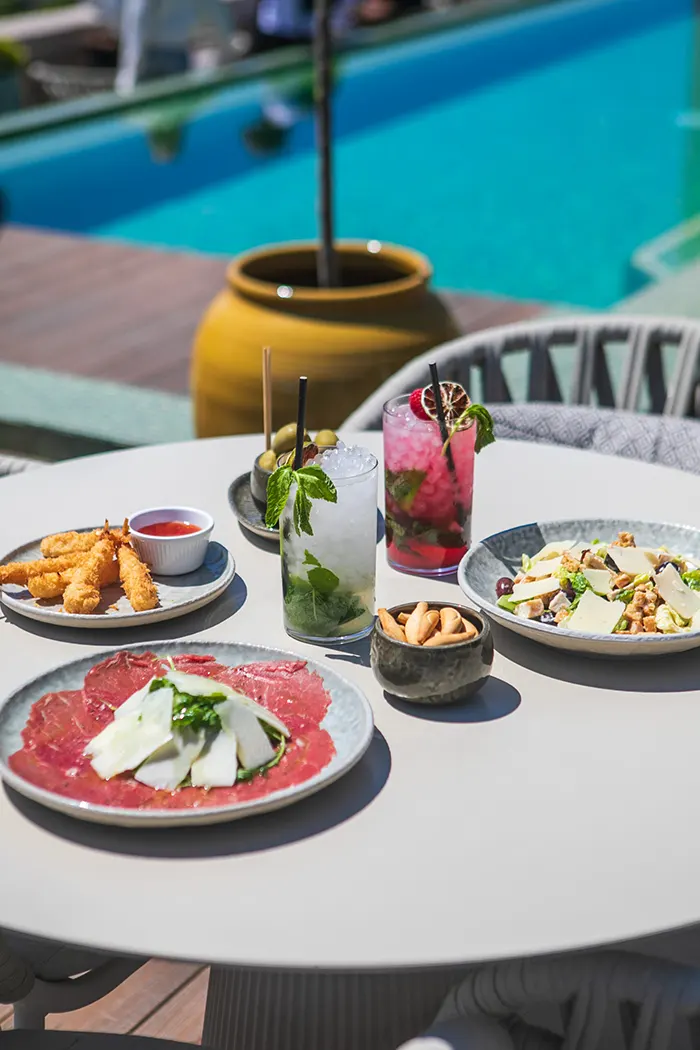 Uno de los grandes atractivos del Skybar es su oferta gastronómica y de coctelería. Aquí no solo se viene a beber, también a degustar. La carta incluye tapas mediterráneas reinterpretadas en clave moderna, ideales para compartir mientras se disfruta de la puesta de sol.
